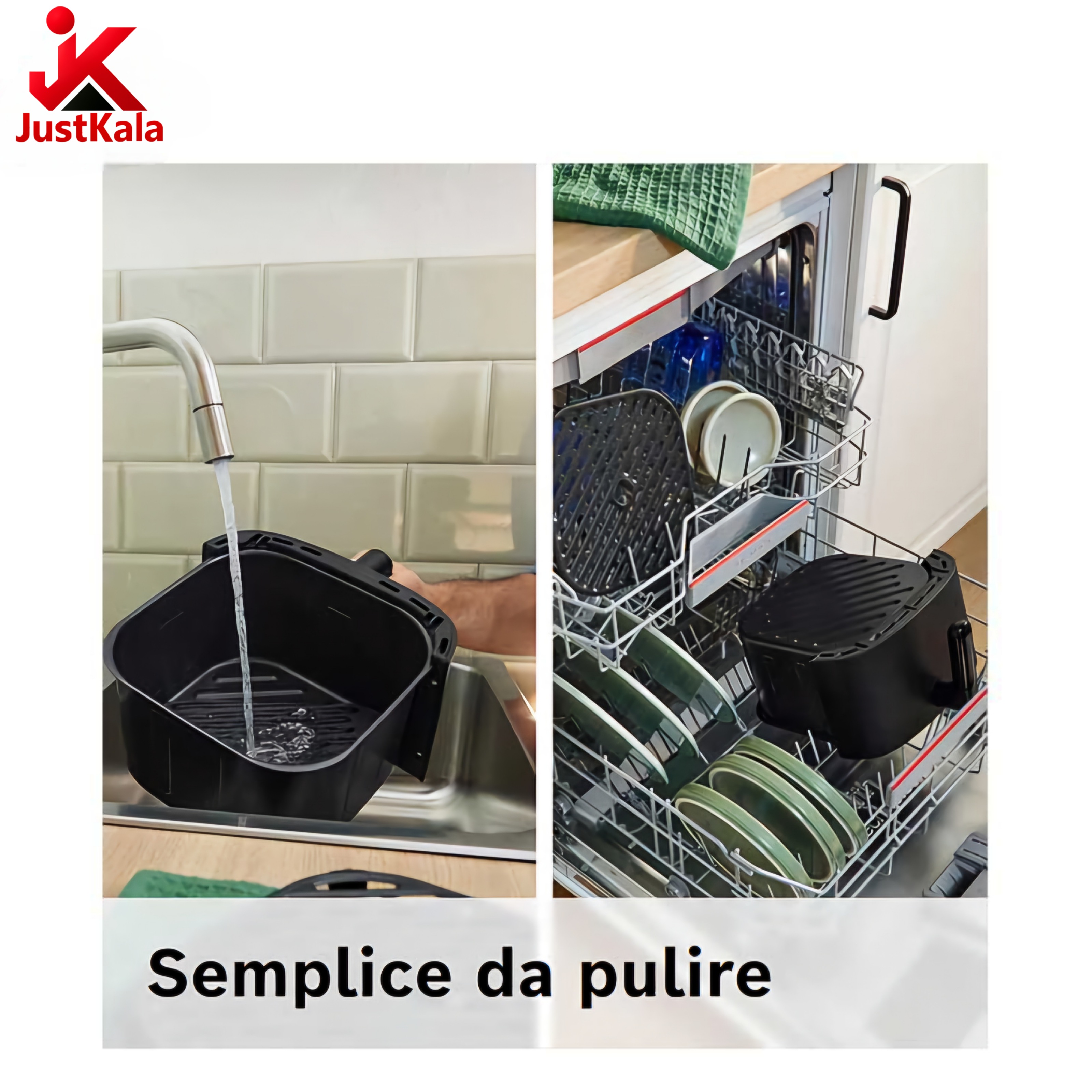 این دستگاه کمحجم و سبک طراحی شده و فضای زیادی روی پیشخوان یا داخل کابینت اشغال نمیکند. سبد کشویی بزرگ آن میتواند حجم زیادی از مواد غذایی، حتی یک مرغ کامل را در خود جای دهد.