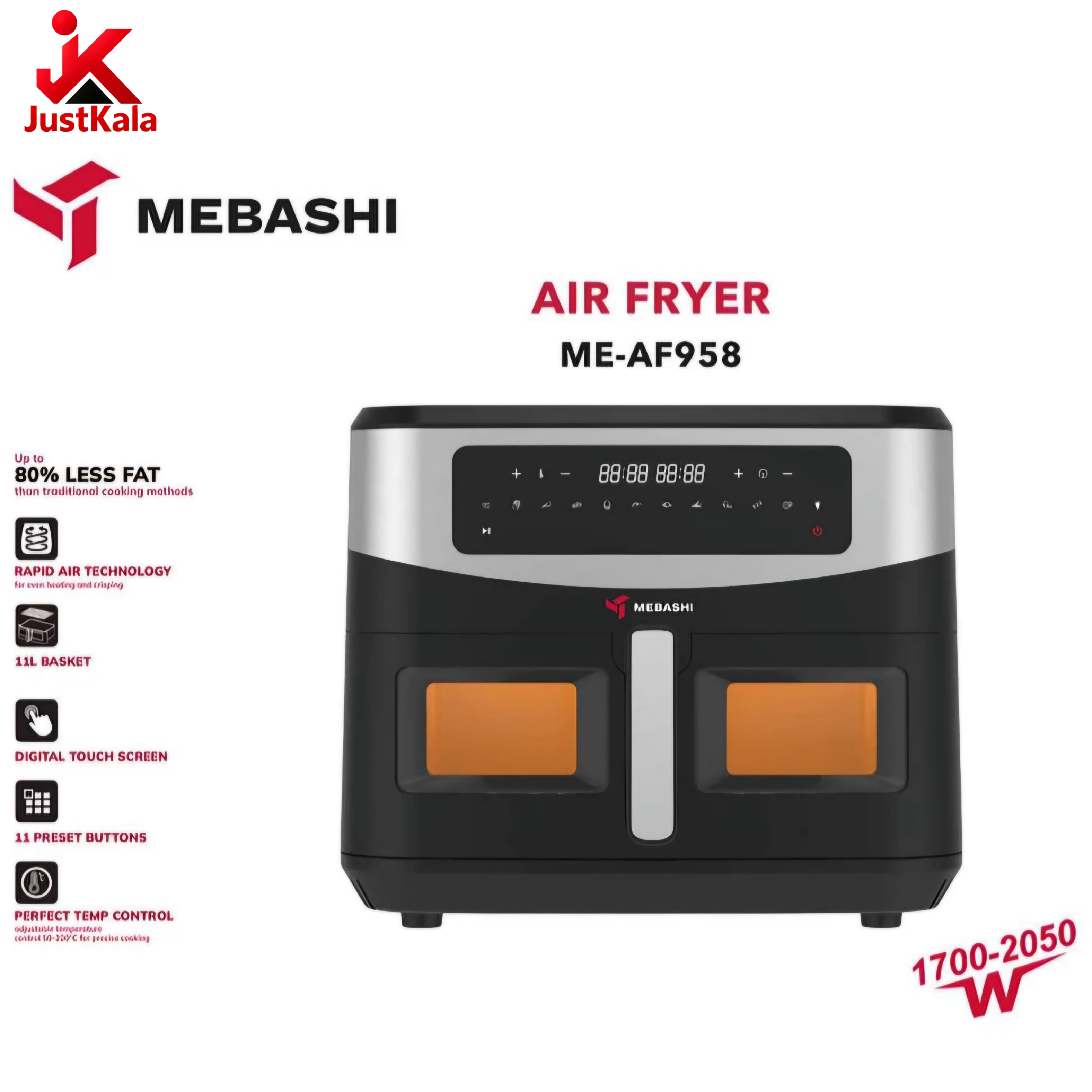 سرخکن مباشی مدل ME-AF958 یک هواپز بدون روغن با ظرفیت 11 لیتر و توان حدود 2050 وات است که برای خانوادههای پرجمعیت طراحی شده. این دستگاه دارای 12 برنامه پخت، نمایشگر لمسی دیجیتال و سیستم گردش هوای سریع است. کیفیت ساخت خوب و امکانات ایمنی دارد.