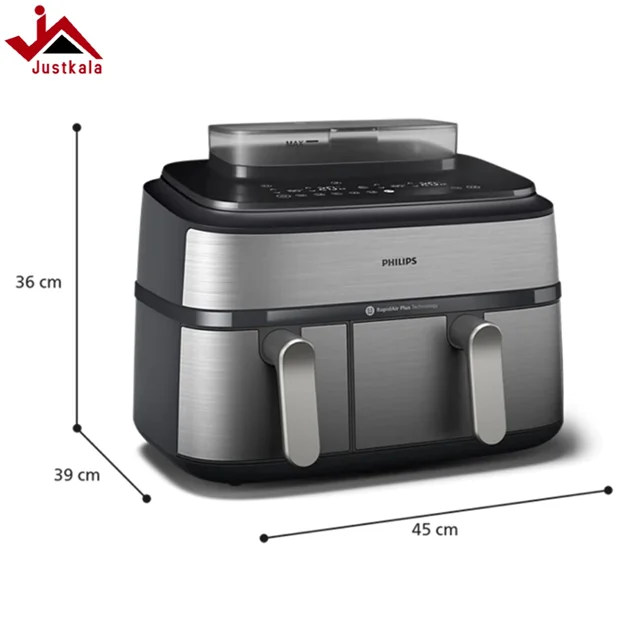 طراحی این دستگاه کاملاً مدرن و کاربردی است. بدنهای از جنس پلاستیک مقاوم و استیل ضدزنگ، علاوه بر زیبایی ظاهری، دوام بالایی دارد. مهمترین ویژگی در طراحی، وجود دو محفظه مستقل پخت است که به شما امکان میدهد دو نوع غذای متفاوت را به طور همزمان و با تنظیمات جداگانه طبخ کنید.